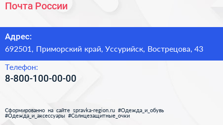 Почта России по адресу 692501, Приморский край, Уссурийск, Вострецова, 43 в дальнейшем Организация, размещена в следующих категориях: