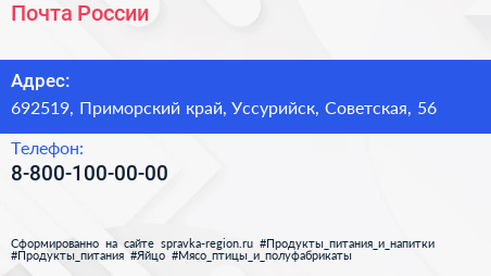 Почта России по адресу 692519, Приморский край, Уссурийск, Советская, 56 в дальнейшем Организация, размещена в следующих категориях: