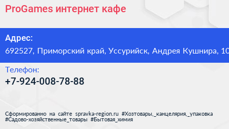 ProGames, интернет-кафе по адресу 692527, Приморский край, Уссурийск, Андрея Кушнира, 10 в дальнейшем Организация, размещена в следующих категориях: