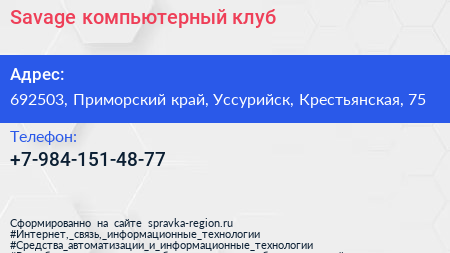 Savage, компьютерный клуб по адресу 692503, Приморский край, Уссурийск, Крестьянская, 75 в дальнейшем Организация, размещена в следующих категориях: