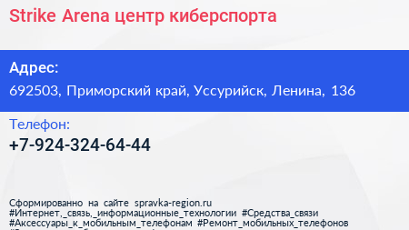 Strike Arena, центр киберспорта по адресу 692503, Приморский край, Уссурийск, Ленина, 136 в дальнейшем Организация, размещена в следующих категориях: