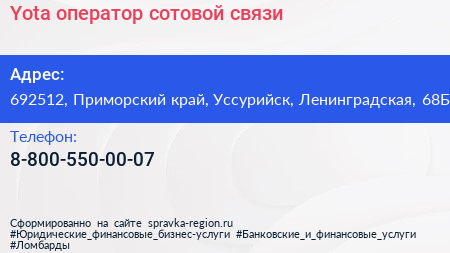 Yota, оператор сотовой связи по адресу 692512, Приморский край, Уссурийск, Ленинградская, 68Б в дальнейшем Организация, размещена в следующих категориях: