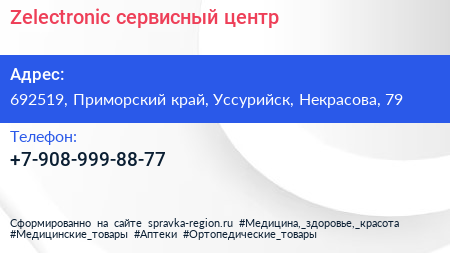 Zelectronic, сервисный центр по адресу 692519, Приморский край, Уссурийск, Некрасова, 79 в дальнейшем Организация, размещена в следующих категориях: