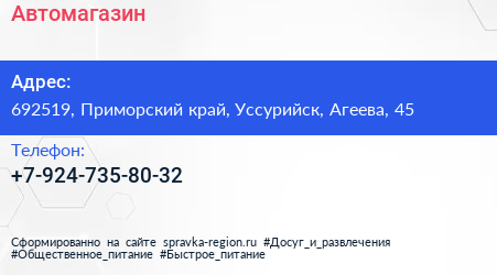 Автомагазин по адресу 692519, Приморский край, Уссурийск, Агеева, 45 в дальнейшем Организация, размещена в следующих категориях: