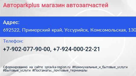 Автоparkplus, магазин автозапчастей по адресу 692522, Приморский край, Уссурийск, Комсомольская, 130 в дальнейшем Организация, размещена в следующих категориях: