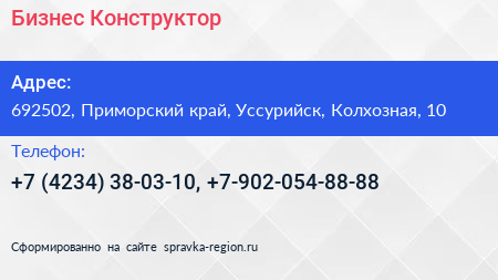 Бизнес Конструктор по адресу 692502, Приморский край, Уссурийск, Колхозная, 10 в дальнейшем Организация, размещена в следующих категориях: