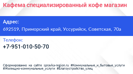 Кафема, специализированный кофе-магазин по адресу 692519, Приморский край, Уссурийск, Советская, 70а в дальнейшем Организация, размещена в следующих категориях: