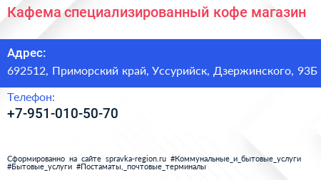 Кафема, специализированный кофе-магазин по адресу 692512, Приморский край, Уссурийск, Дзержинского, 93Б в дальнейшем Организация, размещена в следующих категориях: