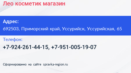 Лео-косметик, магазин по адресу 692503, Приморский край, Уссурийск, Уссурийская, 65 в дальнейшем Организация, размещена в следующих категориях: