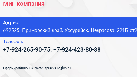 МиГ, компания по адресу 692525, Приморский край, Уссурийск, Некрасова, 221Б ст2 в дальнейшем Организация, размещена в следующих категориях: