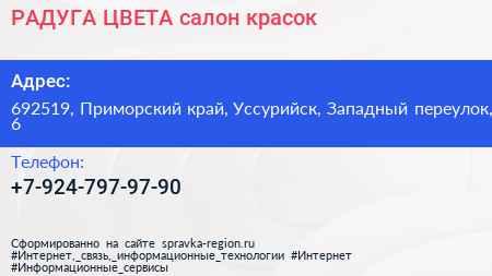 РАДУГА ЦВЕТА, салон красок по адресу 692519, Приморский край, Уссурийск, Западный переулок, 6 в дальнейшем Организация, размещена в следующих категориях: