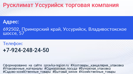 Русклимат-Уссурийск, торговая компания по адресу 692502, Приморский край, Уссурийск, Владивостокское шоссе, 57 в дальнейшем Организация, размещена в следующих категориях: