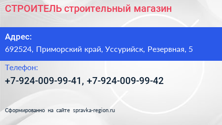 СТРОИТЕЛЬ, строительный магазин по адресу 692524, Приморский край, Уссурийск, Резервная, 5 в дальнейшем Организация, размещена в следующих категориях: