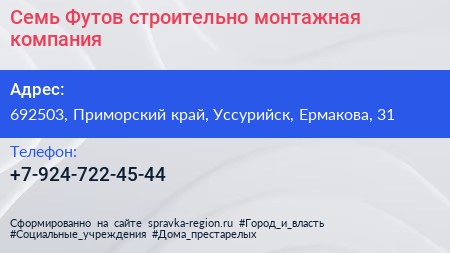 Семь Футов, строительно-монтажная компания по адресу 692503, Приморский край, Уссурийск, Ермакова, 31 в дальнейшем Организация, размещена в следующих категориях: