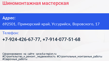 Шиномонтажная мастерская по адресу 692501, Приморский край, Уссурийск, Воровского, 17 в дальнейшем Организация, размещена в следующих категориях: