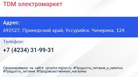 TDM, электромаркет по адресу 692527, Приморский край, Уссурийск, Чичерина, 124 в дальнейшем Организация, размещена в следующих категориях: