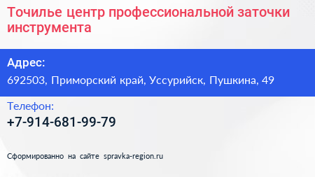 Точилье, центр профессиональной заточки инструмента по адресу 692503, Приморский край, Уссурийск, Пушкина, 49 в дальнейшем Организация, размещена в следующих категориях: