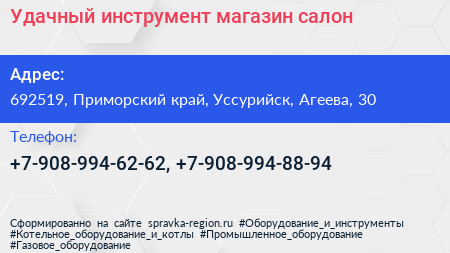 Удачный инструмент, магазин-салон по адресу 692519, Приморский край, Уссурийск, Агеева, 30 в дальнейшем Организация, размещена в следующих категориях: