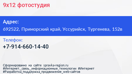9x12, фотостудия по адресу 692522, Приморский край, Уссурийск, Тургенева, 152в в дальнейшем Организация, размещена в следующих категориях: