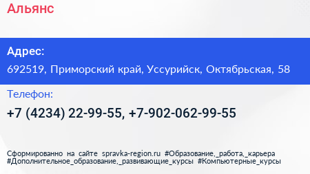 Альянс по адресу 692519, Приморский край, Уссурийск, Октябрьская, 58 в дальнейшем Организация, размещена в следующих категориях: