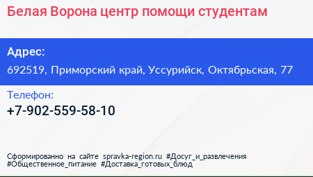 Белая Ворона, центр помощи студентам по адресу 692519, Приморский край, Уссурийск, Октябрьская, 77 в дальнейшем Организация, размещена в следующих категориях: