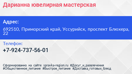 Дарианна, ювелирная мастерская по адресу 692510, Приморский край, Уссурийск, проспект Блюхера, 22 в дальнейшем Организация, размещена в следующих категориях: