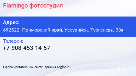 Flamingo, фотостудия по адресу 692522, Приморский край, Уссурийск, Тургенева, 33а в дальнейшем Организация, размещена в следующих категориях:
