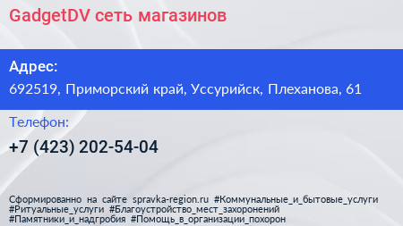 GadgetDV, сеть магазинов по адресу 692519, Приморский край, Уссурийск, Плеханова, 61 в дальнейшем Организация, размещена в следующих категориях: