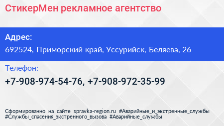 СтикерМен, рекламное агентство по адресу 692524, Приморский край, Уссурийск, Беляева, 26 в дальнейшем Организация, размещена в следующих категориях: