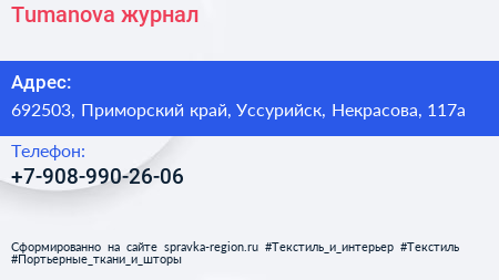 Tumanova, журнал по адресу 692503, Приморский край, Уссурийск, Некрасова, 117а в дальнейшем Организация, размещена в следующих категориях: