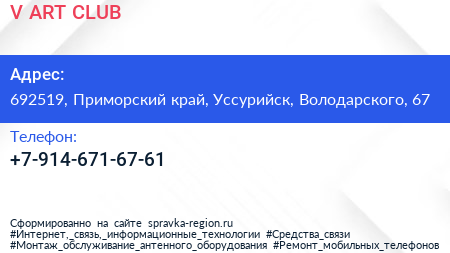 V-ART CLUB по адресу 692519, Приморский край, Уссурийск, Володарского, 67 в дальнейшем Организация, размещена в следующих категориях: