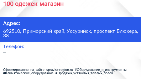 100 одежек, магазин по адресу 692510, Приморский край, Уссурийск, проспект Блюхера, 38 в дальнейшем Организация, размещена в следующих категориях: