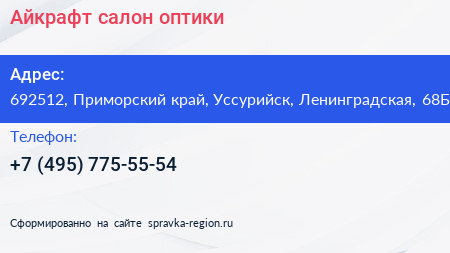 Айкрафт, салон оптики по адресу 692512, Приморский край, Уссурийск, Ленинградская, 68Б в дальнейшем Организация, размещена в следующих категориях: