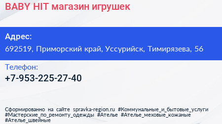 BABY-HIT, магазин игрушек по адресу 692519, Приморский край, Уссурийск, Тимирязева, 56 в дальнейшем Организация, размещена в следующих категориях: