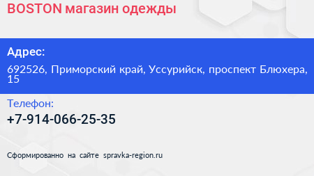 BOSTON, магазин одежды по адресу 692526, Приморский край, Уссурийск, проспект Блюхера, 15 в дальнейшем Организация, размещена в следующих категориях: