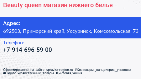 Beauty queen, магазин нижнего белья по адресу 692503, Приморский край, Уссурийск, Комсомольская, 73 в дальнейшем Организация, размещена в следующих категориях: