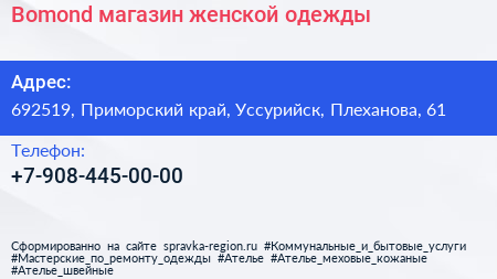 Bomond, магазин женской одежды по адресу 692519, Приморский край, Уссурийск, Плеханова, 61 в дальнейшем Организация, размещена в следующих категориях: