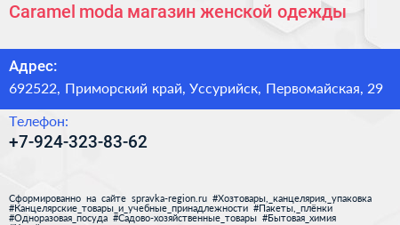 Caramel moda, магазин женской одежды по адресу 692522, Приморский край, Уссурийск, Первомайская, 29 в дальнейшем Организация, размещена в следующих категориях: