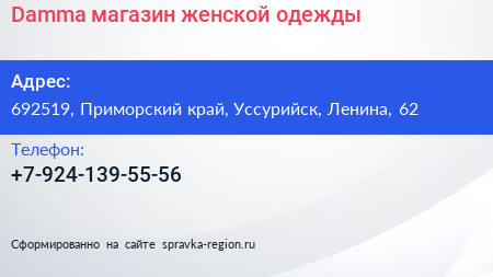 Damma, магазин женской одежды по адресу 692519, Приморский край, Уссурийск, Ленина, 62 в дальнейшем Организация, размещена в следующих категориях: