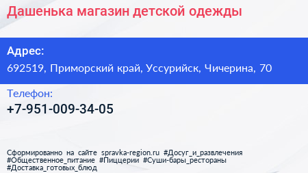 Дашенька, магазин детской одежды по адресу 692519, Приморский край, Уссурийск, Чичерина, 70 в дальнейшем Организация, размещена в следующих категориях: