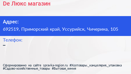 De Люкс, магазин по адресу 692519, Приморский край, Уссурийск, Чичерина, 105 в дальнейшем Организация, размещена в следующих категориях: