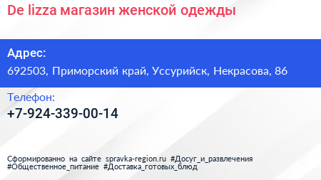 De`lizza, магазин женской одежды по адресу 692503, Приморский край, Уссурийск, Некрасова, 86 в дальнейшем Организация, размещена в следующих категориях: