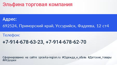 Эльфина, торговая компания по адресу 692524, Приморский край, Уссурийск, Фадеева, 12 ст4 в дальнейшем Организация, размещена в следующих категориях: