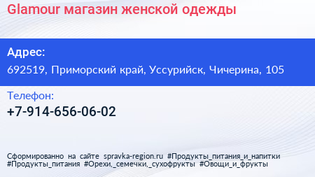 Glamour, магазин женской одежды по адресу 692519, Приморский край, Уссурийск, Чичерина, 105 в дальнейшем Организация, размещена в следующих категориях:
