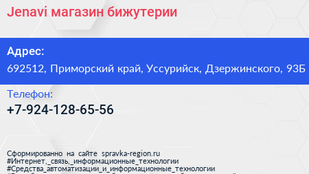 Jenavi, магазин бижутерии по адресу 692512, Приморский край, Уссурийск, Дзержинского, 93Б в дальнейшем Организация, размещена в следующих категориях: