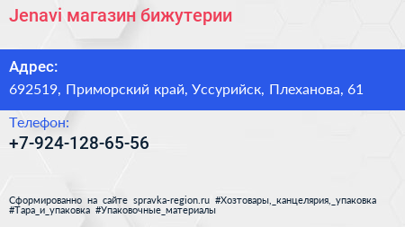 Jenavi, магазин бижутерии по адресу 692519, Приморский край, Уссурийск, Плеханова, 61 в дальнейшем Организация, размещена в следующих категориях: