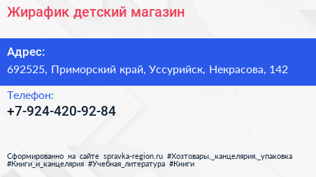 Жирафик, детский магазин по адресу 692525, Приморский край, Уссурийск, Некрасова, 142 в дальнейшем Организация, размещена в следующих категориях: