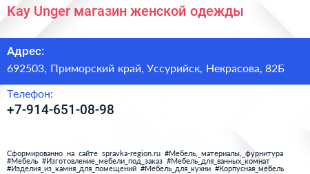 Kay Unger, магазин женской одежды по адресу 692503, Приморский край, Уссурийск, Некрасова, 82Б в дальнейшем Организация, размещена в следующих категориях: