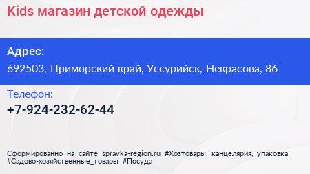 Kids, магазин детской одежды по адресу 692503, Приморский край, Уссурийск, Некрасова, 86 в дальнейшем Организация, размещена в следующих категориях: