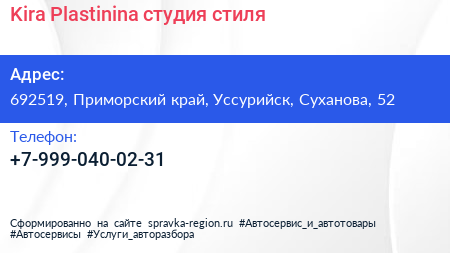 Kira Plastinina, студия стиля по адресу 692519, Приморский край, Уссурийск, Суханова, 52 в дальнейшем Организация, размещена в следующих категориях: